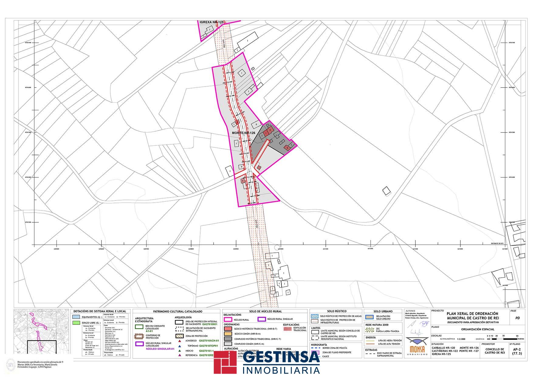 La casa está rodeada de una magnífica finca de 21.334 metros cuadrados de los que 2.451 m² son suelo de NÚCLEO RURAL (COMPLEXO COMÚN (SNR/C-M) en el que se podría edificar según el PLAN XERAL DE ORDENACIÓN MUNICIPAL DE CASTRO DE REI (MONTE NR-126) en parcelas mínimas de 700 m² con una ocupación de parcela para residencial en grado 1º del 40% para vivienda aislada con una edificabilidad de del 0.45 m²/m², siendo por lo tanto una gran oportunidad para adquirir una magnífica vivienda con la posibilidad de parcelar y vender fincas edificables posteriormente. Toda la normativa completa se encuentra aprobada en sesión plenaria del 9 de marzo del 2020 del Ayuntamiento de Castro de Rey por el que se aprobó el PG de Ordenación del Municipio y se encentra a disposición del publico en la página web del XIOTUGA.