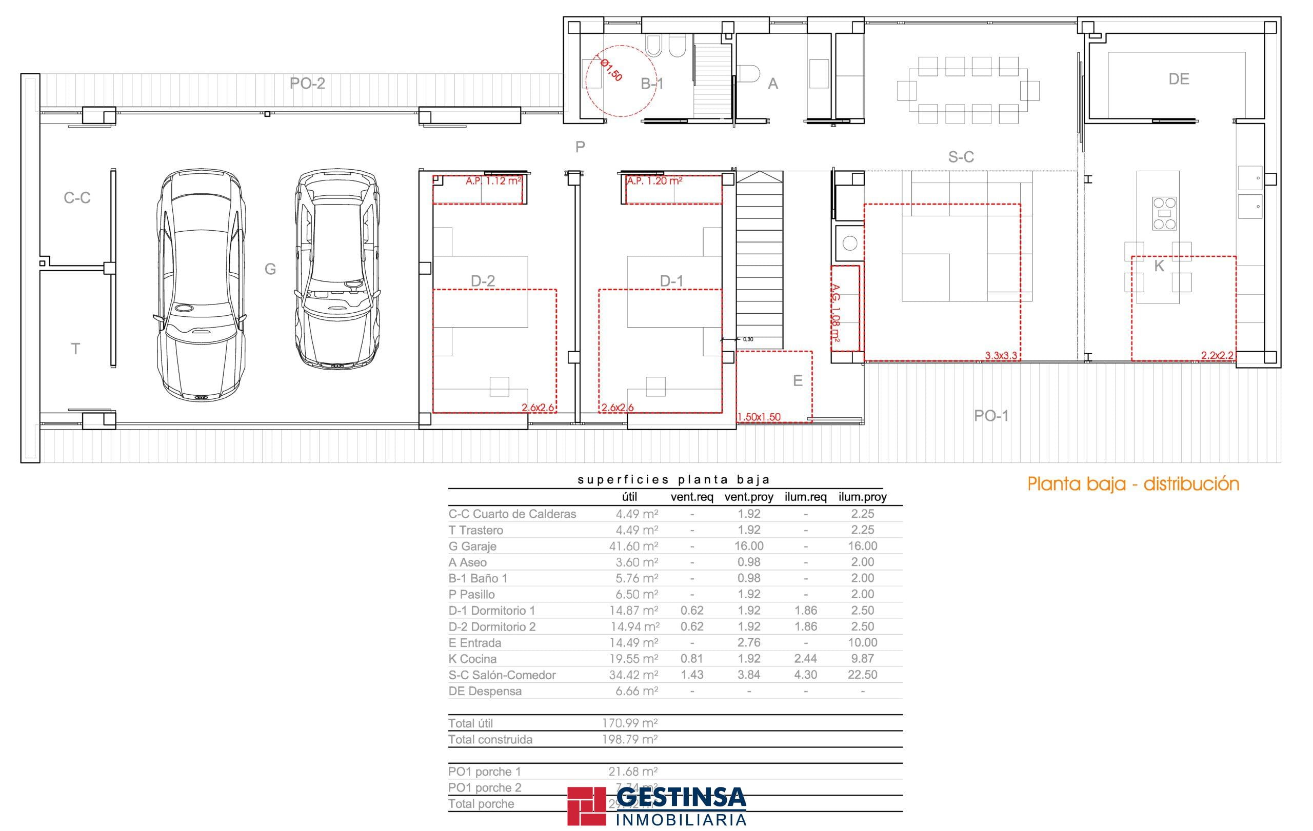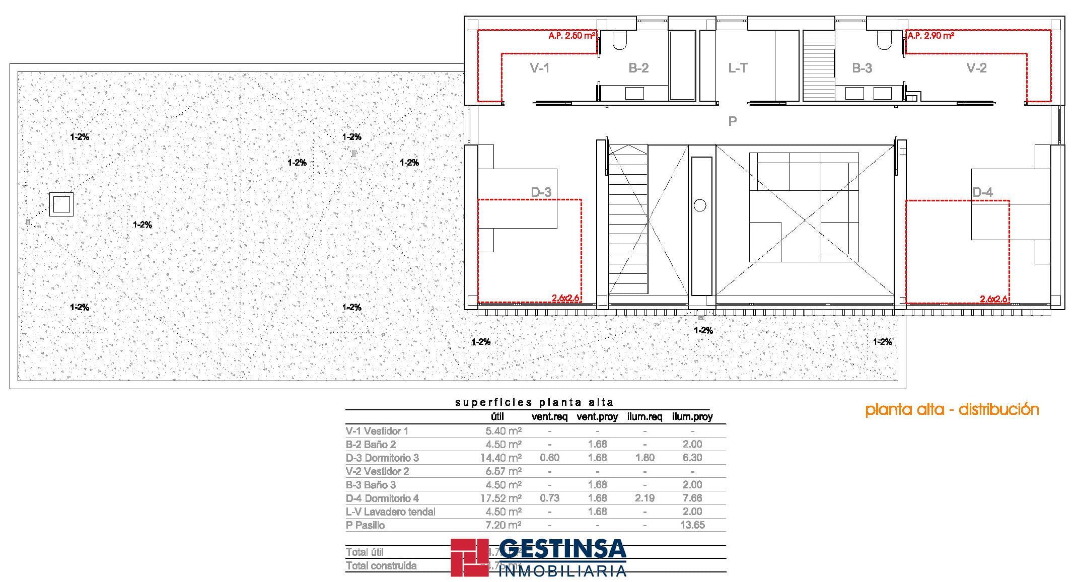 La casa dispondría de dos dormitorios en planta baja y dos en planta alta, estos últimos con vestidor y baño.